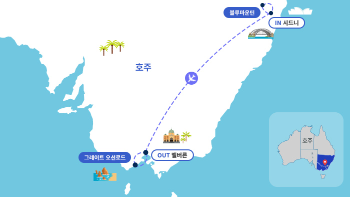 멜버른 : <오크스온마켓 또는 동급>■ 객실 사용 안내 - 성인 2인 1실 기준 / 1객실 최대 3인 투숙 가능 - 3인 1실 투숙 시 : 2싱글 1엑스트라베드 / 1더블 1엑스트라베드 / 2더블 중 랜덤 배정 예정■ 관광지 - 메트로폴리탄 속의 유럽 멜버른 시내관광 - 장대한 자연의 파노라마 12사도 그레이트 오션 로드, 벨스비치, 아드고지해안, 런던브릿지 - 시드니 핵심 시내관광 : 하버브릿지, 오페라하우스, 미세스 맥콰리체어 등 - 블루마운틴 : 시닉 3종 탑승 포함 블루마운틴 전경 감상