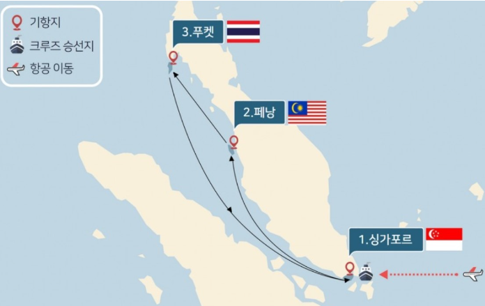 [도시 안내] ▶ 동남아시아 최고의 부국이며 세계 경제의 중심지, 동남아시아 크루즈의 허브도시 싱가포르 관광▶ '동양의 진주'라는 별칭답게 다채로운 볼거리와 훌륭한 관광 인프라로 가득한 페낭 관광▶ 전세계인이 사랑하는 10대 휴양섬 리스트에 매년 이름을 올리는 세계적인 휴양명소 푸켓 관광
