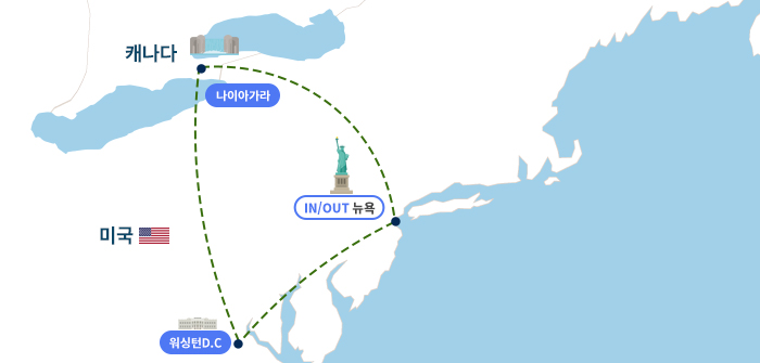【 지역별 관광지 소개 및 혜택 】전세계에서 가장 트렌드한 도시! 『뉴욕』 미국의 수도이자 백악관, 연방의사당이 있는 『워싱턴』세계 3대 폭포 중 하나인 『나이아가라 폭포』 관광미국 독립 100주년을 기념하여 프랑스에서 기증한 『자유의 여신상 유람선』 탑승 뉴욕 맨해튼에 위치한 초고층 복합건물인 『원 월드 트레이드 센터 전망대』세계 3대 폭포 중 하나인 나이아가라 폭포에서 『시티 크루즈』 탑승